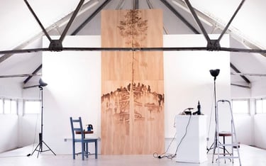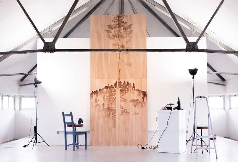 Groningen‑based artist Nick Willems (b. 1989, The Netherlands) is renowned for his radical technique of “painting with destruction”, burning images onto wooden panels to explore themes of impermanence, transformation, and nature. Using fire and heat, Willems carves and layers images while preserving the natural character of the wood, creating works rooted in intentional craftsmanship and respect for material and place